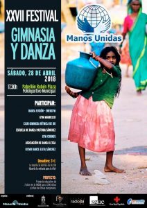 Este próximo sábado, 28 de abril de 2018, a las 17.30 h., tendrá lugar el festival de Gimnasia y Danza a beneficio de Manos Unidas, en el pabellón Rubén Plaza del polideportivo municipal. El donativo será de 3€ y con la entrada se participará en una rifa que tendrá lugar durante el evento.